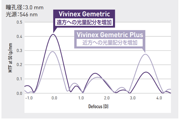 HOYAが開発した「ジェメトリック/ジェメトリックプラス(Vivinex Gemetric / plus)」は、従来の回折型とは異なる発想から設計された新しいタイプのレンズで、遠方から中間距離の見え方の質を重視したジェメトリックと、近方視力をより強化したジェメトリックプラスの2種類があります。